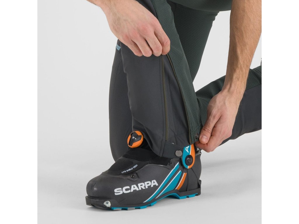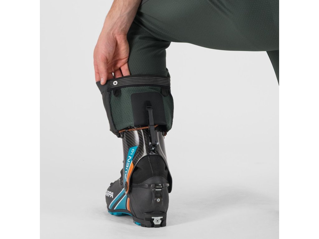 • Nastaviteľný spodný okraj: Zips na spodnej časti s rozširovacím klinom umožňuje ľahké prispôsobenie rôznym typom skialpinistických lyžiarok.