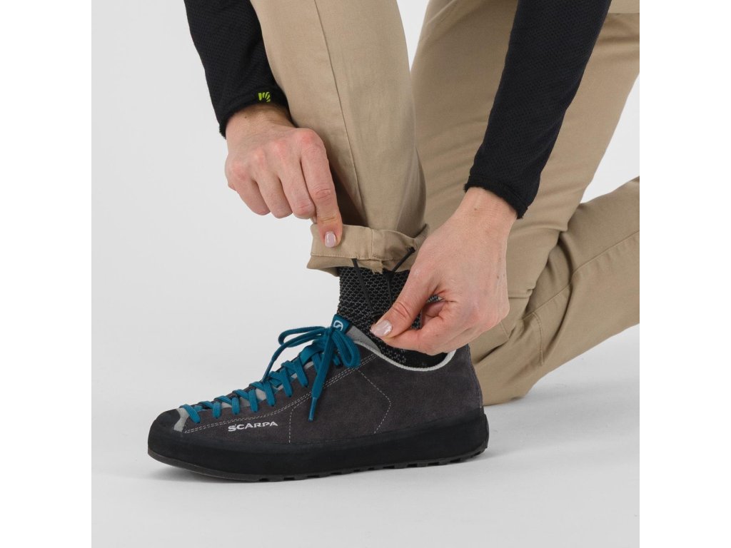 • Spodná časť nohavíc je vybavená sťahovacou šnúrkou, ktorá umožňuje úpravu šírky nohavíc. Tento detail taktiež zaisťuje, že nohavice zostanú stabilné počas lezenia alebo iných outdoorových aktivít.