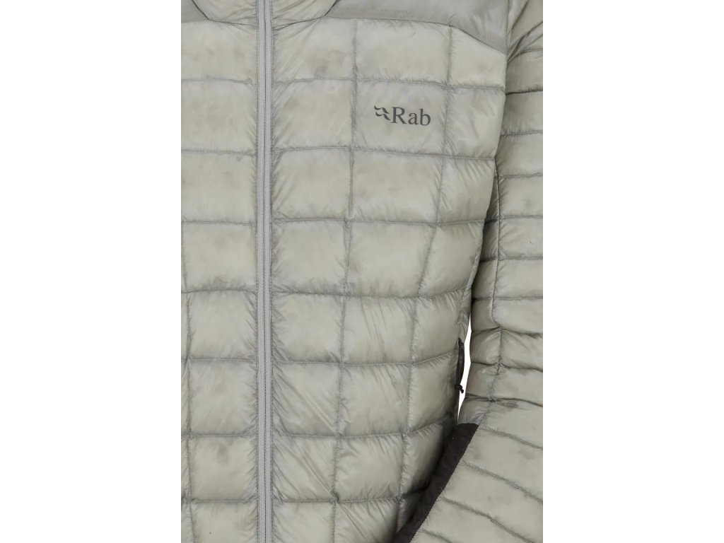 Aby konštruktéri dokázali zraziť výslednú hmotnosť na absolútne minimum, použili pre tento model extrémne ľahký a 100% recyklovaný 10D Pertex® Quantum ripstop. Ten je aj napriek svojej extrémne nízkej váhe dostatočne pevný, odolný a neprefúkavý ale zároveň aj mäkký a príjemný na nosenie. Samozrejmosťou je u bundy tejto kategórie aj vodoodpudivá povrchová DWR úprava. V prípade klimaticky neutrálnej spoločnosti Rab bez fluorocarbonov. Výsledná hmotnosť je tak parádnych 277 gramov vo veľ. M.