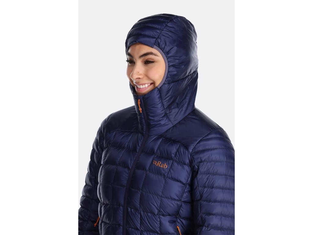 Rab aj pri tomto modeli využil nový strih bundy s „predkrútenými“ rukávmi umožňujúcimi ešte väčšiu voľnosť pohybu paží toľko potrebnej pre horolezecké aktivity a navyše šetrí hmotnosť. Toto sa ťažko popisuje, určite odporúčame vyskúšať, pretože akonáhle tento kúsok hodíš na seba, hneď budeš vedieť o čom hovoríme. Bunda je celkovo skôr užšieho strihu. Rovnako pekne sedí aj kapucňa ktorej tesnosť zaisťuje, rovnako ako konce rukávov, elastický lem. Drží na hlave ako pribitá a pri pohybe sa kapucňa hýbe s vami a nijako nebráni voľnosti pohybu a periférnemu videniu, ale nie je určená na použitie cez prilbu. Spodný lem bundy je ošetrený protišmykovou úpravou a je jednostranne nastaviteľný. Centrálny zips YKK® je zakončený fleecovou podšívkou na ochranu brady. Dve veľké zipsové (tiež YKK) vrecká na ruky oproti predchodcovi potešia, ale v rámci úspory váhy nie sú podložené perím.