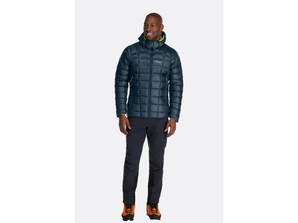 Bunda Rab Mythic Alpine má na hrudníku prešívanú konštrukciu, ktorá maximalizuje teplo a na rukávoch klasickú konštrukciu s priečnymi komorami pre lepšiu voľnosť pri pohybe paží. Rukávy sú navyše šité podľa nového strihu bundy s anatomicky "predkrútenými rukávmi". Akonáhle bundu hodíte na seba, hneď pochopíte o čom tu píšeme. Parádne sediaca kapucňa je okolo tváre stiahnutá elastickým lemom, ktorý krásne sadne a kapucňu utesňuje. V prípade nutnosti je určená pod prilbu. Centrálny YKK® zips je zakončený fleecovou podšívkou na ochranu brady a je jednocestný. Dve veľké vrecká na ruky sú taktiež s YKK zipsom, ale v rámci úspory váhy nie sú podložené perím. Spodný lem bundy je možné ľahko obojstranne nastaviť a je ošetrený protišmykovou úpravou.